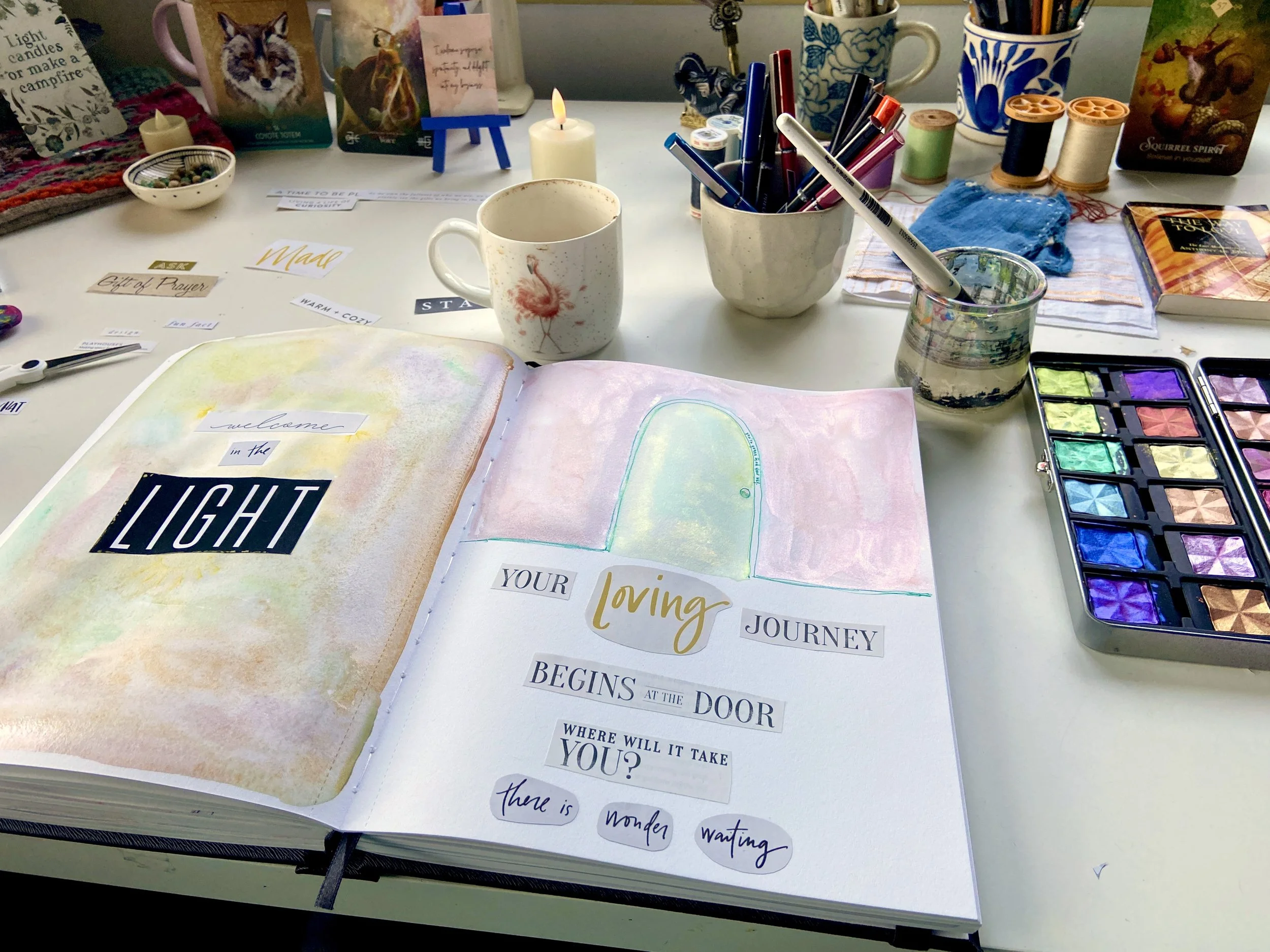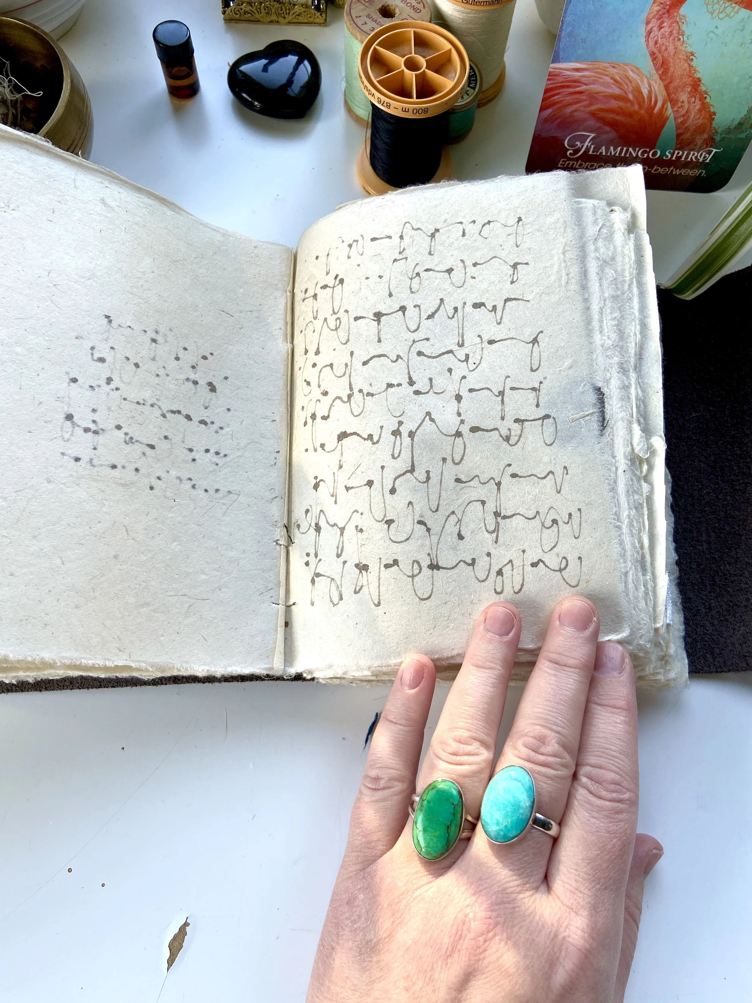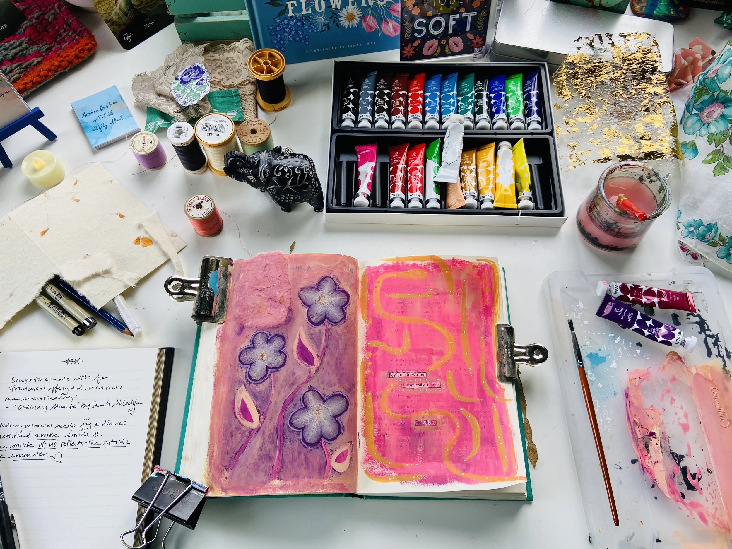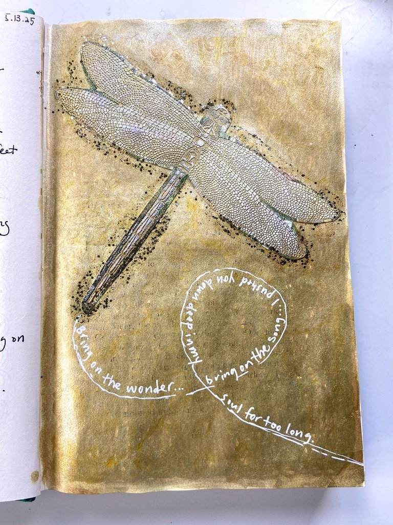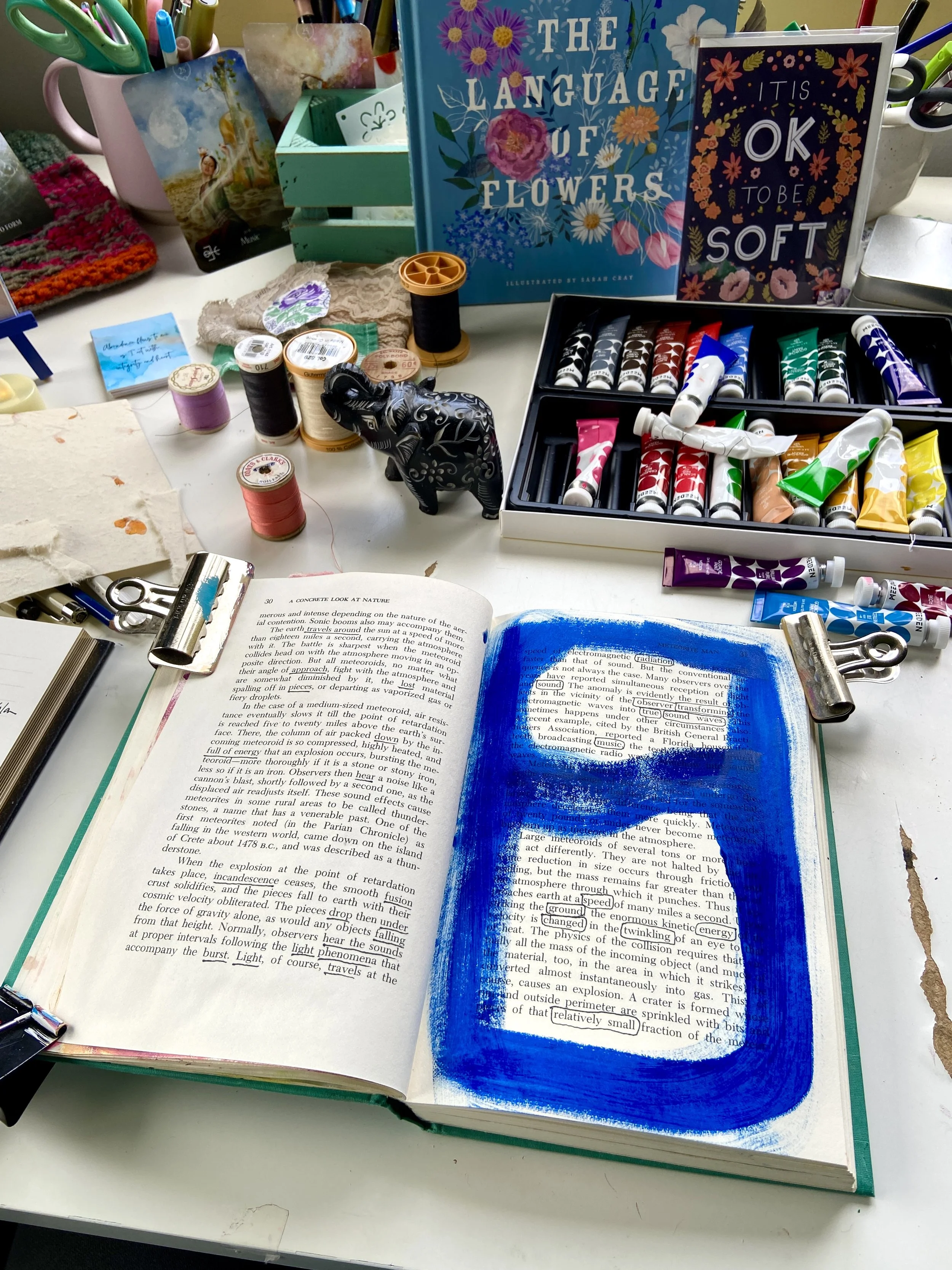 I have worked in art journals and sketchbooks for many years and have turned to them as a retreat, a sanctuary from the rest of the world and to process my emotions and navigate my life. They are a physical place where I can quietly go and ask questions, explore, feel, play, have slow and fascinating conversations, learn and experiment, work things through in my mind and heart and feel held and supported. They are an intimate space for just me to travel within. I have worked in vintage books I found at thrift stores, art store sketchbooks and hand bound books full of handmade Nepalese loktah papers. I hope you enjoy looking at some of the books I have filled with my heart.