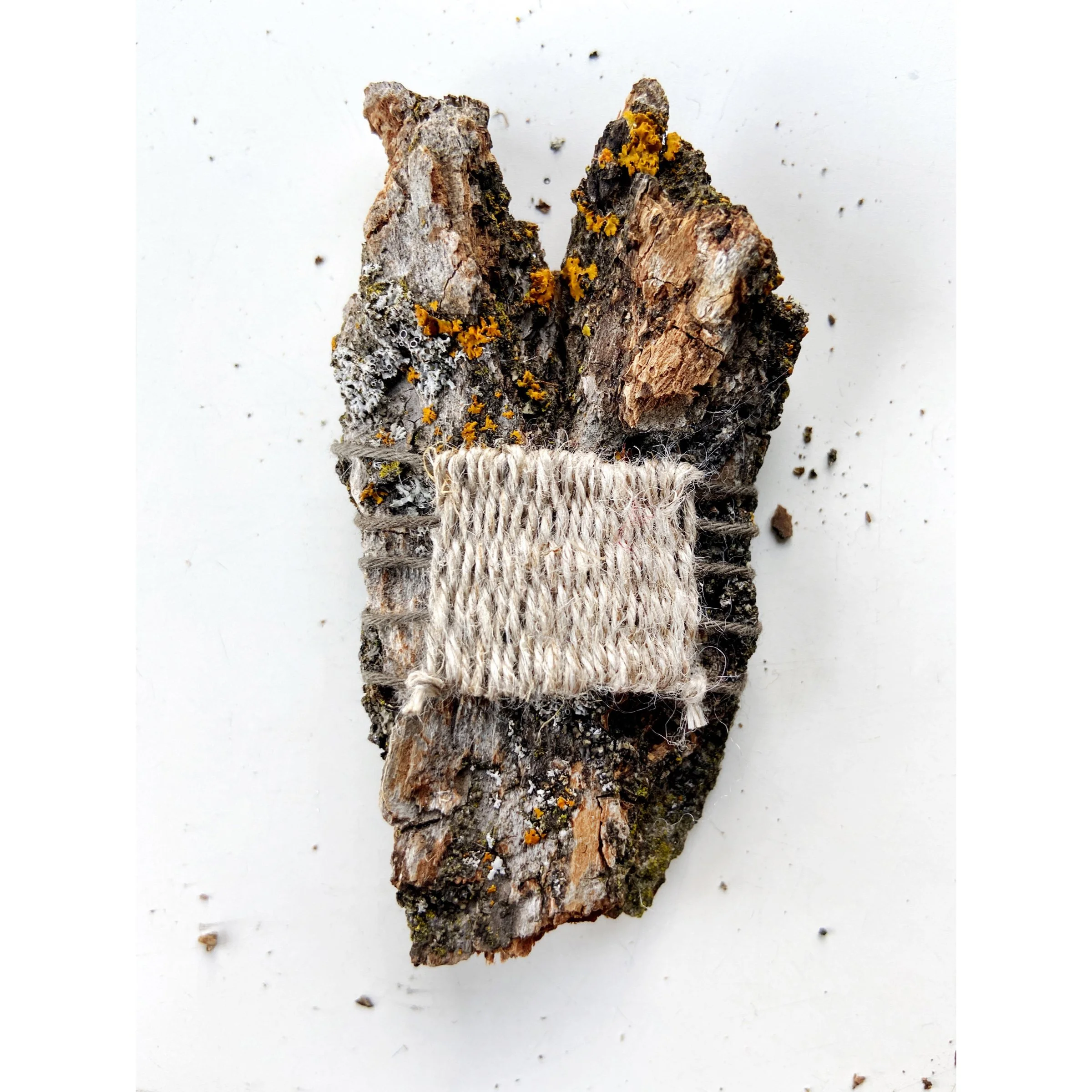 Bark pieces with woven yarn designs on wooden surface